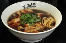メインメニューは大阪ご当地の“高井田系”のラーメンだ。スープは鶏ガラ、濃口しょうゆ、ネギのざく切りを乗せた中太麺の一品だ。黒いスープが特徴で、しょうゆの香りが食欲をそそる。