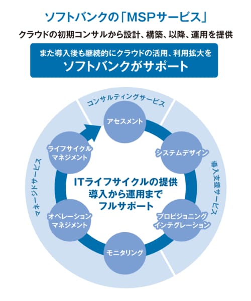 マネージドサービスプロバイダー(MSP)とは、企業のITシステムの稼働状況の監視や運用・保守までをトータルで提供するサービスのことを言う。ソフトバンクでは、日本マイクロソフトが展開する「Microsoft Azure」をはじめとするパブリッククラウドの販売にあたって、関連するネットワークやセキュリティなどを包括的に提供し、トータルサポートを行なっている。
