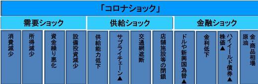 次に、下記の図表を使って、「コロナショック」にかかわるリスクシナリオについて考察していきたいと思います。まず、経済においては、「需要ショック」「供給ショック」「金融ショック」の3つがトリプルショックと呼ばれますが、これらの中でも、「需要ショック」は、私たち自身が消費者としてすでに体感し、懸念し始めているのものではないでしょうか。