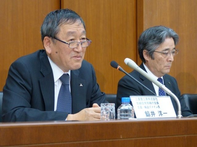 客船を巡る巨額損失計上について緊急会見を開き、経緯を報道陣やアナリストに説明した。写真左が交通・輸送部門を統括する鯨井常務執行役員、右が経理担当の野島常務執行役員