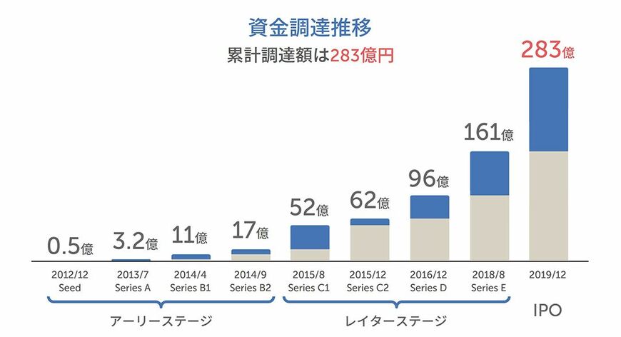 2015年8月から2018年8月までのレイターステージでは、4回にわたり144億円を調達しました。金額がぐっと大きくなったのは、この頃からビジネスが大きくなり、市場で評価されるようになり、ビジネスモデルも認知されるようになってきたからです。