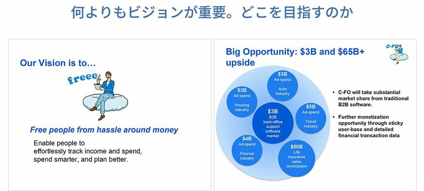 アーリーステージでは、何よりもビジョンが重要です。プロダクトさえなく、1円も売上が立っていない、あるいは立っていたとしても初期ユーザーだけという状態で、投資家が評価するのはビジョンであり、どこを目指しているのかです。