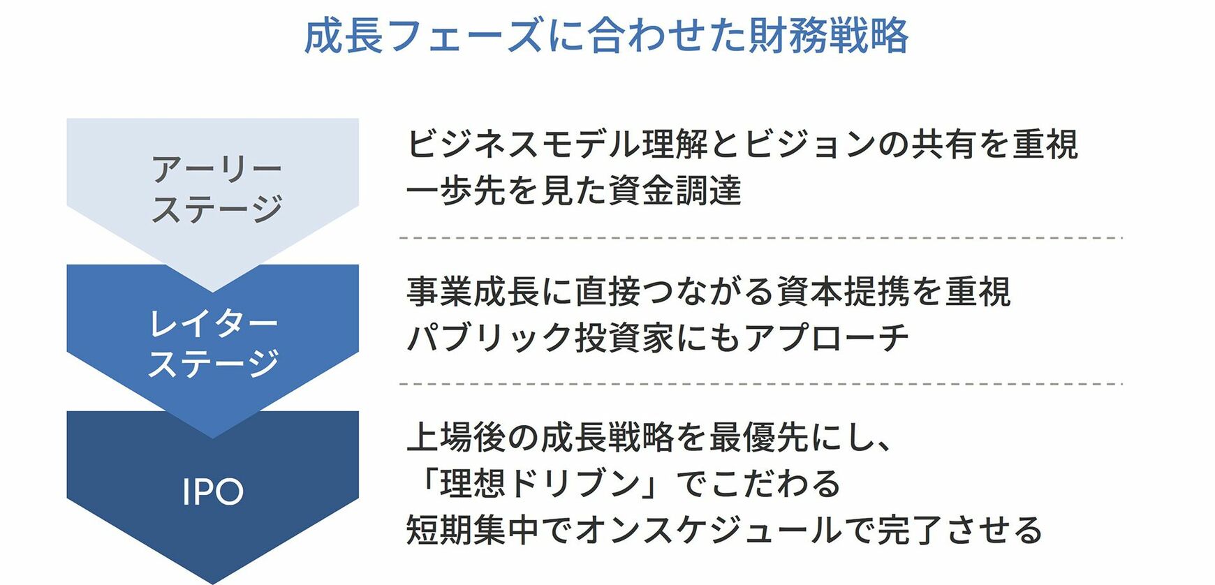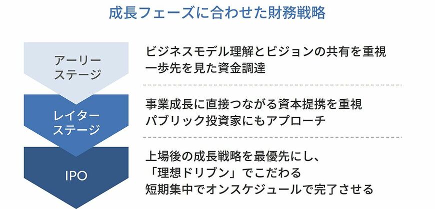 アーリーステージ、レイターステージ、IPOというそれぞれの成長ステージに合わせた財務戦略があることを最後に強調しておきます。