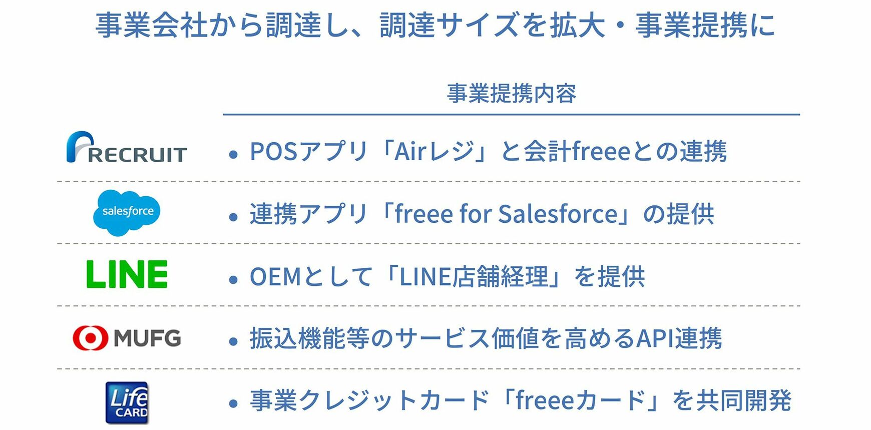 投資家の顔ぶれも大きく変わりました。国内のベンチャーキャピタル以外にも、リクルートやセールスフォース、LINEといった事業会社が入ってきたのです。これは最初から意図していたわけではありませんが、一定のビジネス基盤が構築できた中で、さらなる成長を目指すにあたり、事業提携を前提に資金調達を進めてきたことが大きいです。