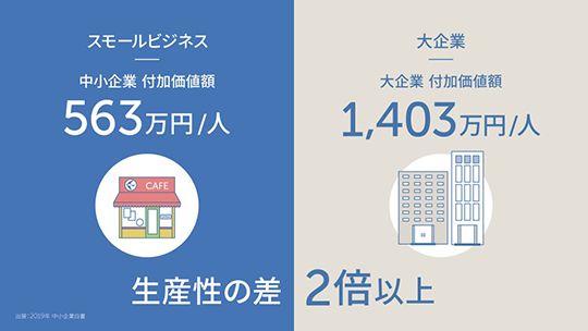 テクノロジーの観点では大企業と中小企業の差は小さくなってきましたが、「人」の部分に着目すると、むしろ格差は広がっています。例えば、労働生産性。日本の労働生産性は先進7カ国の中で最下位と言われますが、日本の大企業と中小企業とでは、さらに2倍以上の格差があります。生産年齢人口が減っていく中で、いかに人材を確保するかも中小企業にとっては大きな課題です。