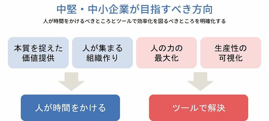 本質的価値提供や組織作りなど、本当に重要なところは、今まで以上に時間とコストをかけて、独自性の高いものをつくっていくこと。それができないと、中小企業としての強みは生かせないし、人に関わる課題も乗り越えられません。ただ、これをやっていると収益性が下がるだけなので、人の力をツールによって最大化し、生産性向上に結び付けられることが重要です。
