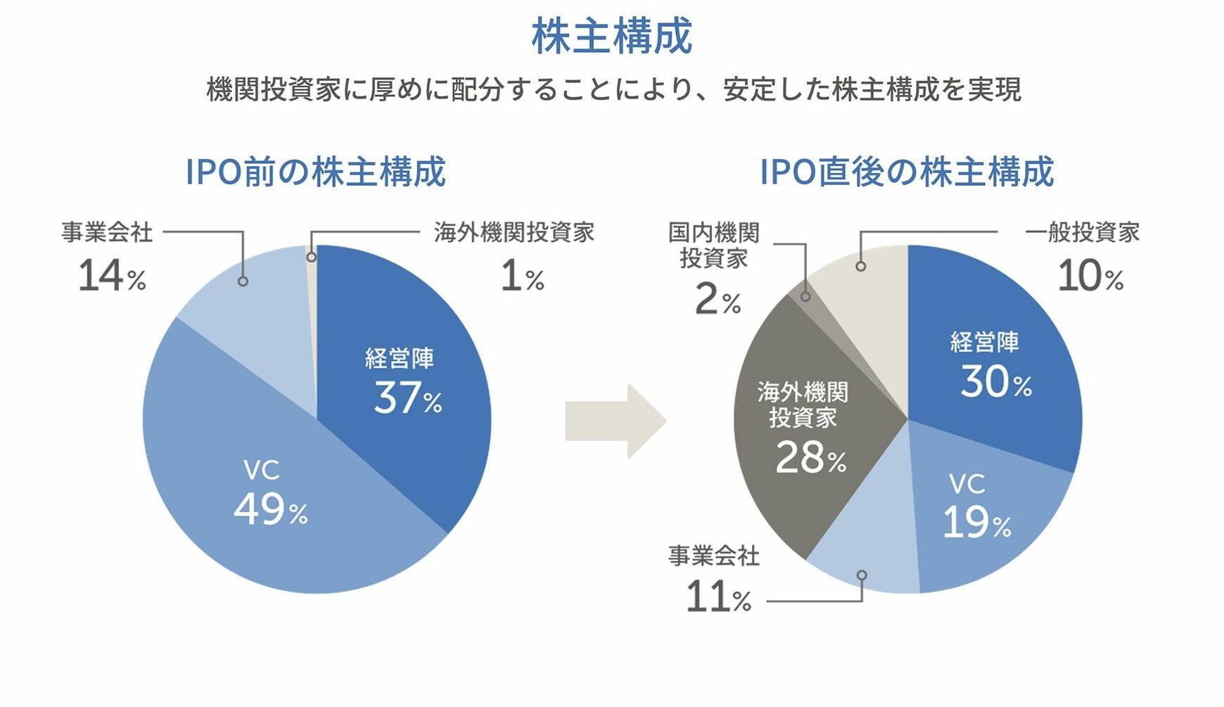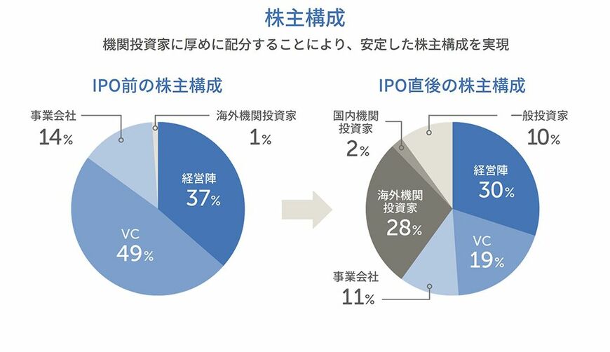 海外投資家の比率を高めたことも大きな特徴です。結果的に経営陣、ベンチャーキャピタル、事業会社、海外機関投資家、国内機関投資家、一般投資家などでバランスの取れた株主構成になったと評価しています。
