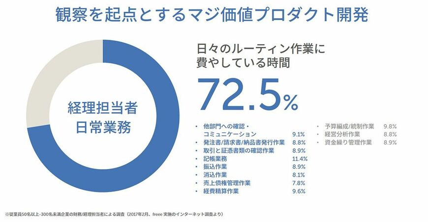 我々のソフトウェア開発を例にとります。経理業務を自動化する会計ソフトというコンセプトですが、リリースする前は、そうした顧客ニーズではありませんでした。お客様が求めていたのは入力を速くするソフトでした。ただ、観察の結果気づいたことは、経理担当者の日常業務の7割がルーティン作業で、自動化すればその作業は効率化できるということです。それを実現するソフトを開発すれば、真の価値を世の中に提供できると考えました。