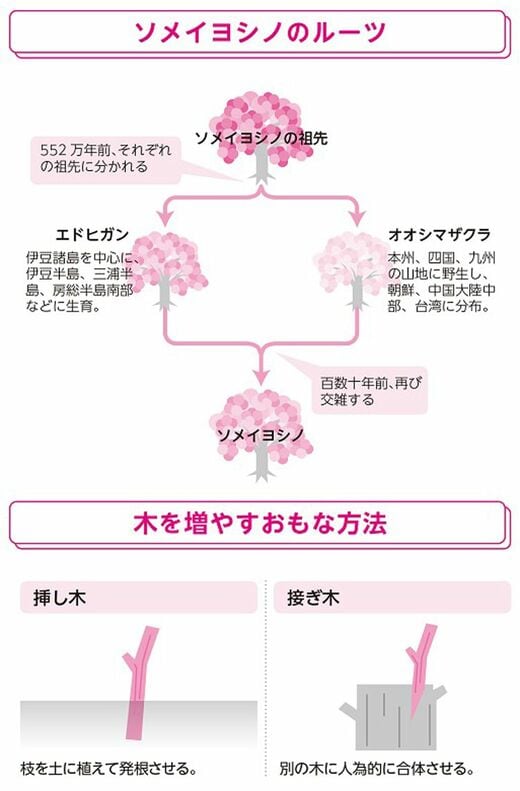 ソメイヨシノは江戸時代後期、染井村(現在の東京都豊島区駒込あたり)の植木職人によって作出されたといわれる。しかし、ソメイヨシノ同士では交配することができず、接ぎ木という方法でしか増やせない。そこで、1本のソメイヨシノの原木から接ぎ木によって増やしていったのである。