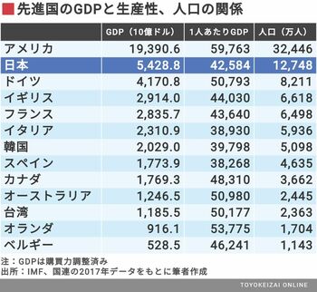 日本はGDP総額が大きく、世界第3位、先進国では世界第2位の経済大国です。この順位だけを見ると、豊かな国のように映ります。しかし、GDP総額が大きいのは人口が多いからで、決して豊かなわけではありません。実際、日本の生産性と所得は非常に低水準で、1人当たりのGDP(=生産性)は世界第28位。大手先進国では最下位です。