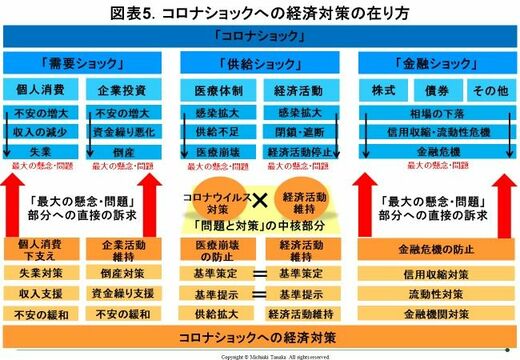 私は、コロナショックへの経済対策のあり方について、「コロナショックから日本を守る経済対策の要諦」(3月18日配信)で論じました。その全体構造を以下にも示しておきます(図表5)。
