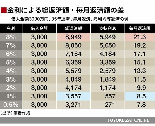 例えば、3000万円を35年返済(元利均等返済)で借りた場合の例(下図)で言えば、金利1%なら総返済額は3557万円、毎月返済額は8.5万円です。これが、金利8%となると総返済額は8949万円で毎月返済額は21.3万円ほど。借りた額の3倍弱を返済することになります。金利4%台なら借りた額の約2倍、2%台なら約1.5倍を返済するというイメージです。