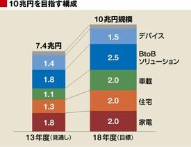 10兆円の内訳は、従来から掲げる家電、住宅、車載で売上高2兆円ずつ、BtoB(法人向け)ソリューション分野で2.5兆円(2013年度見通し1.8兆円)、デバイス分野で1.5兆円(同1.4兆円)だ。