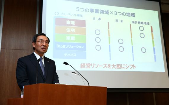 2012年度まで2期連続で7000億円以上の最終赤字に沈んだパナソニック。2013年度~2015年度の3カ年中期計画では、営業利益3500億円以上、営業利益率5%以上を目指し、赤字事業からの撤退や、住宅や車載分野を中心とする法人向け事業へのシフトを進めている。