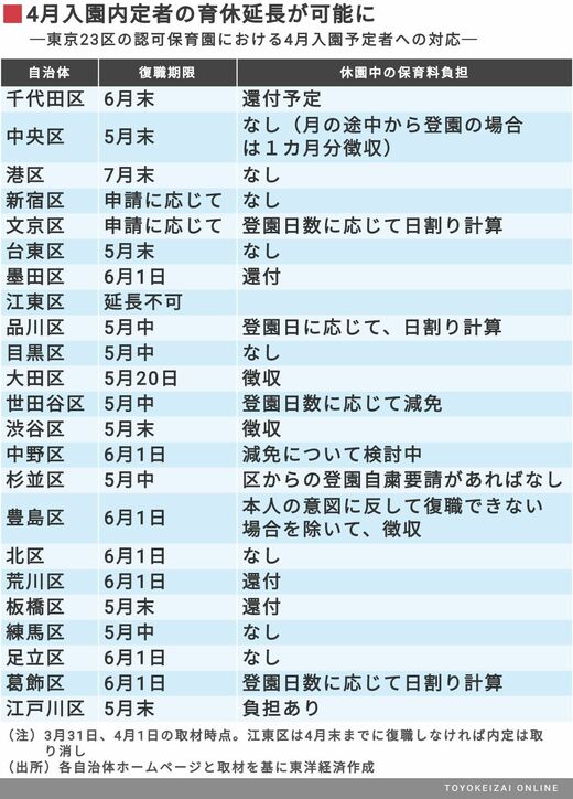 新年度を目前に控えた3月下旬以降増えてきたのが、4月に認可保育園への入園が内定していた家庭に対し、入園資格を維持したまま、登園開始時期を5月以降に後ろ倒しできる措置を取る自治体だ。3月6日の内閣府からの要請を受けての決定だ。とくに、感染拡大が深刻化する東京23区では、3月31日と4月1日の取材時点で22区が入園時期の後ろ倒しと、それに伴う保護者の職場復帰時期の延長を認めていることがわかった。