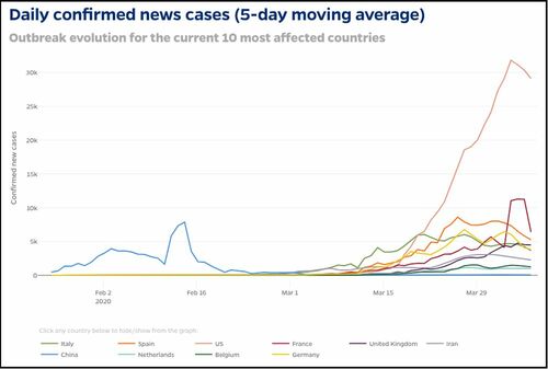 これを見ると、大変な状況を経験し続けているイタリアやスペインでもカーブが比較的、平らになってきていることがわかります。
