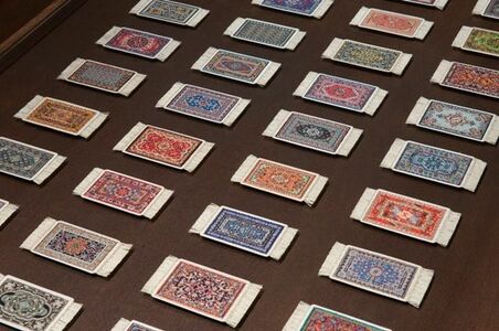 そう語る2人は、身の回りの日用品に丹念に手を加え、価値観やスケール感を問いかける作品を作っている。下の『切り札』は、トランプの幾何学模様と、それによく似た柄のペルシャじゅうたんの写真をもとに、トランプの上に絹糸で模様を刺繍した。安価なトランプと高価なシルクのじゅうたんが対比されている。