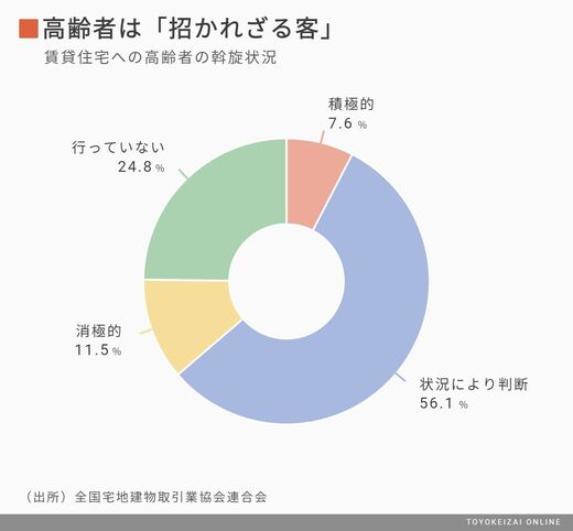 全国宅地建物取引業協会連合会は2018年12月、会員に対して高齢者への賃貸住宅の斡旋に関する調査を行った。それによれば、高齢者への斡旋を「積極的に行っている」と回答した事業者はわずか7.6%。「諸条件により判断している」が56.1%、「消極的」が11.5%、「行っていない」が24.8%と、高齢者の入居に対して前向きでない回答が大半を占めた。