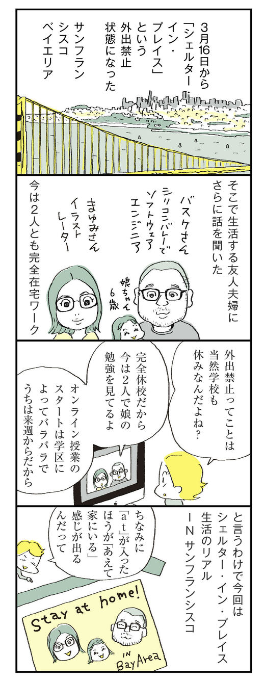 前回から、アメリカ・サンフランシスコのベイエリアに住むある家族の生活を紹介しています。この地域は、かなり早い段階で外出禁止に踏み切り、そのおかげもあってNYと明暗を分けたと言われることもあります。