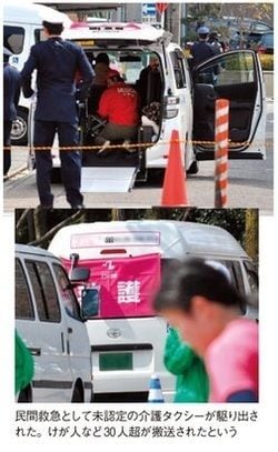 「患者等搬送事業者」とは、東京消防庁の主導で全国に広まった制度で、救急車が出動するほど緊急でない患者を民間車両がカバーする目的のため「民間救急」とも呼ばれる。サイレンがない以外は公的な救急車とほとんど変わらない「医療系」の車両のほか、介護タクシーも事業者が応急手当などの講習を受けたうえで各地の消防本部から認定を得て「福祉系」の民間救急車として活動している。
