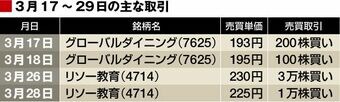 【3月17日(月)】外食のグローバルダイニング(7625)を193円で200株買う。日経平均株価は先週末の14日に488円も下げたにもかかわらず、49円安の1万4277円と下げ止まらず。4日続落で4営業日での下げ幅は、946円と大きい。