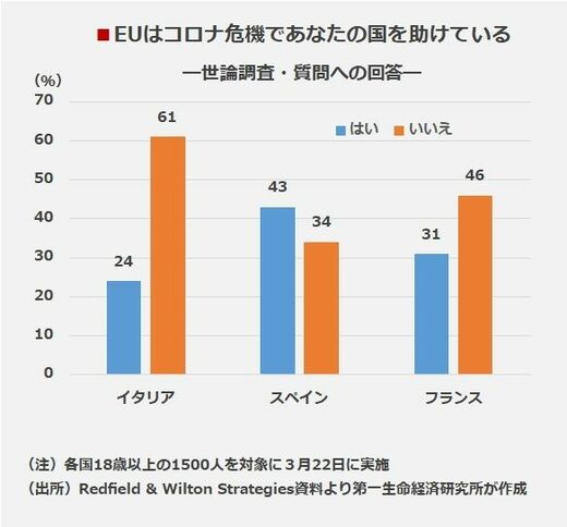 イタリア国民の間では、コロナ危機対応でEUが自国の助けになっていないとの不満が高まっている。加盟国間の連帯(ソリダリティ)をうたうEUの存在意義が今こそ問われている。
