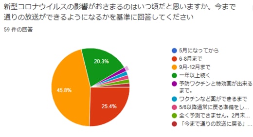 約7割がローカル局、約2割が民放キー局、残り1割弱がケーブルテレビ局だった。また一部業界団体など広い意味での放送事業関係者もいた。次の質問は「新型コロナウイルスの影響がおさまるのはいつ頃だと思いますか。今まで通りの放送ができるようになるかを基準に回答してください」というもの。
