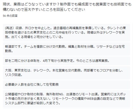 報道以外の担当者の苦悩もうかがえる。「コンテンツ不足。番組編成はアーカイブ放送」「番組のストックがなくなったあとに備えて、再編集ものや再放送可能なソフトを手当てするのが目下の業務」など当面はアーカイブの編集版でしのぐしかない。「緊急事態宣言地域ではないことで、番組ロケがいつまでできるのか不安が高まっている。」「地方都市においても飲食店はじめ店舗紹介、学校関係取材等が難しくなっている。」などの回答から、その傾向が感染者の少ないエリアにも広がりつつあることも伝わってきた。
