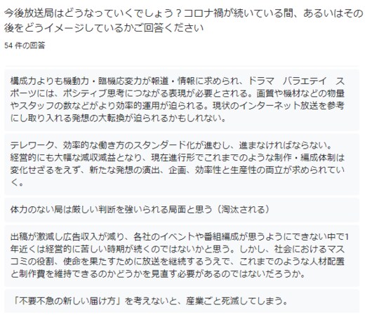 一方で「エンタメとライブ、前者はVOD(動画配信)に、後者はブロードキャスティング(電波放送だけでなくネット放送含む)にシフト」「ローカル局は勤務を無理してまで独自企画をしなくなる(というより、できない)。結果として、ローカル局報道の存在意義は“ニュース取材のみ”に収斂」といった、テレビはエンタメから報道やライブコンテンツにシフトするとの回答もあった。