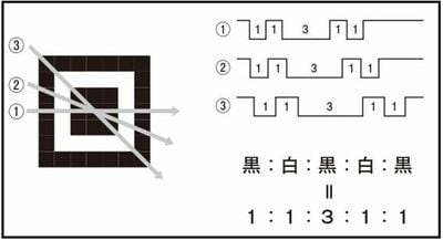 気の遠くなるような作業を経て、白セルと黒セルの幅の比率が1:1:3:1:1で構成される切り出しシンボルを完成。これを3つの隅に配したことで、安定した読み取りが可能となった。数字で約7000文字、漢字やカナもOK、誤り訂正機能がありデータ復元も可能というQRコードが誕生したのは1994年8月だった。