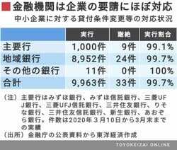 双方を合わせても借り手からの条件変更要請に90%以上応じているというのが現在の状況だ。金融機関は資金繰り支援をかなり積極的に進めている。