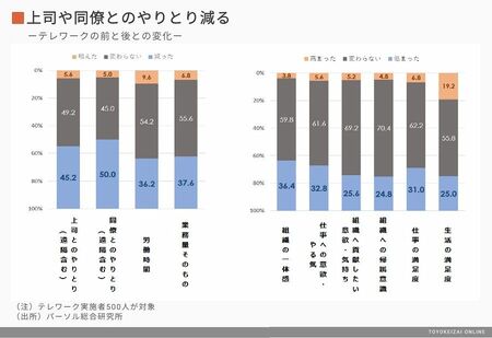 テレワーク前後の変化を聴取したところ、上司、同僚とのやり取りについて「減った」という回答が極めて多い。新型コロナで急にテレワークを行うことになって労働時間、業務量そのものも減っているため、テレワークによって労働密度・交流頻度ともに薄くなっていることがわかる。