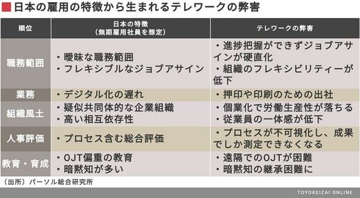 急づくりのテレワークとはいえ、なぜここまで悪い影響がでるのだろうか。実は、テレワークで表面化している組織や業務への弊害の多くは、これまで日本でテレワークが進んでこなかった理由と表裏一体だ。