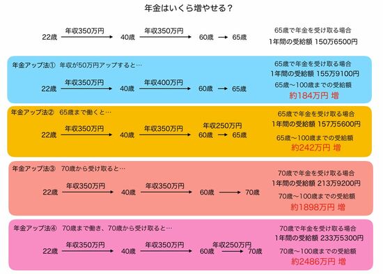 現在の年収は350万円で、これが60歳まで続くとすると、年金額は150万6500円です。まず年金アップ法①として、40歳からの年収を400万円に増やすケースについて試算すると、年金額は約5万2600円アップ。100歳までの累計では約184万円の増額になります。
