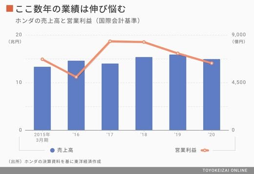 ホンダが同日発表した2020年3月期決算(国際会計基準)は、売上高に当たる売上収益が14兆9310億円(前期比6%減)、営業利益が6336億円(同12.8%減)で減収減益だった。ホンダは海外子会社の決算期が本体と同じであるため、新型コロナによる影響は2020年3月期から入ってくる。外出制限・自粛による販売減少などが響き、営業利益を1300億円下押しした。