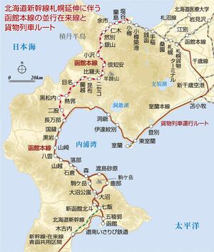 ところが今般の例は、現状の特急旅客が新幹線に移った後の地域内の輸送需要はきわめて細く、それだけに地元の力で並行在来線を維持することは困難視されている。仮に在来線廃止となった場合、当然ながら貨物列車の運行ができなくなる。ある意味「わかりきった」この問題が立ちはだかるため、各種の方策が検討される青函走行のテクニカルな問題に対して、並行在来線問題は現在に至るまで具体的な協議に入れていない。この問題に結論を出し、実行に移さなければならないとなると、「10年」は目前とも言えるほど短い。