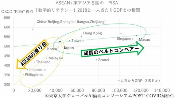 グラフに示されているとおり(ここでは数学的リテラシーの分析結果のみ掲載しているが、他の科目でも同様の結果が得られている※)、日本ならびに韓国は、マレーシアやインドネシアなどを結ぶ回帰直線(黄色のグループ)と、シンガポールや台湾などを結ぶ回帰直線(緑色のグループ)の交点に位置する。ここには、今なお発展途上にあるASEAN諸国のラインと、知識集約型産業中心の東アジア先進諸国(および地域)のラインが、明確に分かれて示されている。