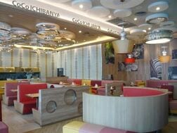 価格を日本と大差ない200バーツ(600円)程度にするかわりに、写真のように、照明を少し落とし、高級感のある内装にして高級ブランドイメージを打ち出した(上の写真)。店内は、ゆったり食事をしてもらえるように一人向けカウンターはなく、テーブルが主体だ(下の写真)。しかも出店は、高級デパートなど超1等地中心に行い、日本式の高級カレー店のイメージを定着させた。