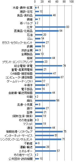 続いて「情報処理・ソフトウェア」、わずか1人の差で「総合電機・家電」が第3位。「情報処理・ソフトウェア」は、専攻が生かしやすい「情報・通信系」からは意外と少なく、41.8%にあたる33人。その他、「電気・電子系」の13人に次いで多かったのは、何と「生物系」の9人。「生物系」の学生だけで見た場合、「医薬品・化粧品」の15人に次いで志望者が多いことになる。
