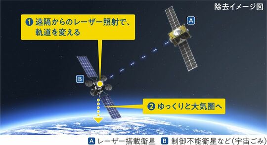 例えば宇宙ごみを磁石やアーム、網などでつかまえて、軌道を変えて高度を下げる方法などもあるが、接近・捕獲のための制御には高度な技術が必要だ。