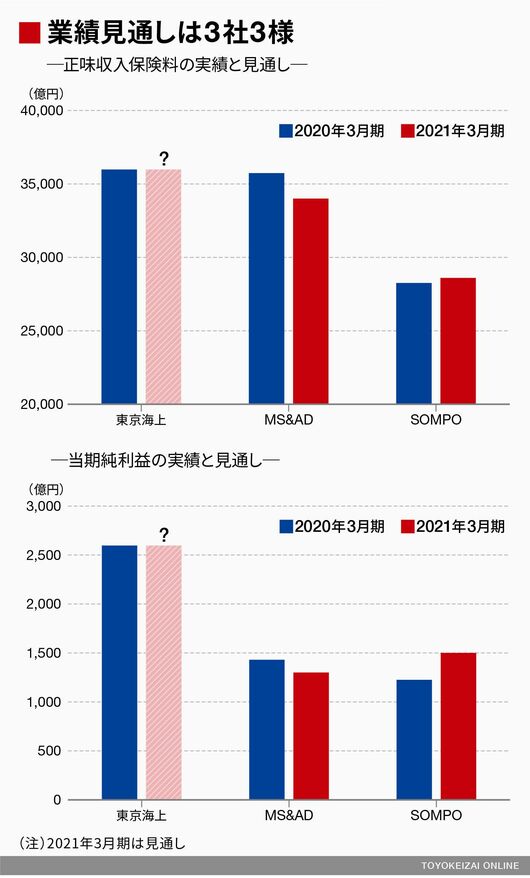 MS&ADは2021年3月期の損保の収入保険料について、新型コロナの影響によって現時点で約900億円減少すると見込んでいる。一方、SOMPOは新型コロナによる影響は「合理的に算出できない」として織り込んでおらず、損保の収入保険料は前年度比で増収と予想している。