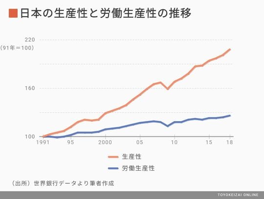 生産性はGDPを総人口で割った数字です。一方、労働生産性はGDPを就業している労働者の数で割ったものです。