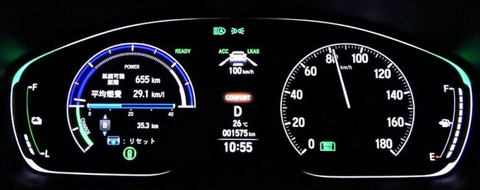 今回、約160㎞試乗した際の総合燃費数値は23.7km/L(高速道路区間では29.1 km/L、郊外路区間は20.1 km/L)だった。後述する「ECON」モードを使わず、「ドライブモードスイッチ」はほぼNORMALモードで記録している。