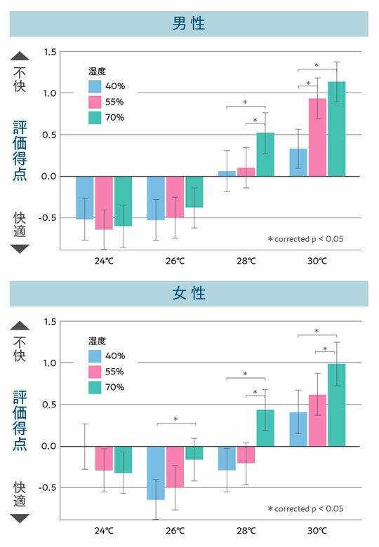 さらに女性特有の現象として、温度24℃で湿度を40%以下に下げると、寒く感じられてしまい快適性が下がった。あくまでも傾向としてだが、男性は温度を24〜26℃に下げること、女性は温度を26〜28℃に保ったまま湿度を55%以下に抑えることが、快適に過ごすコツだ。
