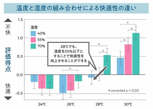 この共同研究では、温度4条件(24、26、28、30℃)と湿度3条件(40、55、70%)を組み合わせ、計12条件の空気環境を設定。健康な成人の男女57名ずつ計114名が、固定された温湿度環境下で過ごしたうえで、10分ごとに快適性などについての評価を行った。その結果、室温28℃の環境下でも、「湿度55%以下」にすると快適性が向上することが実証されたのである。