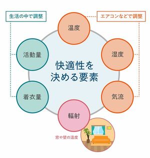 人の快適性を決定づけるのは、「温度」「湿度」だけではない。「輻射(ふくしゃ)」「気流」「活動量(代謝量)」「着衣量」を加えた、全部で6つの要素の組み合わせによって決まる。中でも、大事なのは湿度をコントロールすること。以前もこの連載で紹介したとおり、「温度28℃・湿度85%」の環境では大半の人が不快さを感じたのに対し、温度28℃のままで湿度を「60%」に下げると、12人中10人が「快適」と感じたのである。