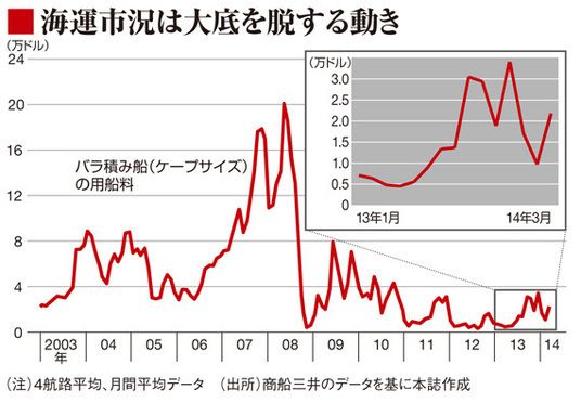 とはいえ、海運各社は比率の小さなフリー船の市況低迷で近年、幾度か大幅赤字を余儀なくされた。ケープサイズの損益分岐点は2万~2.5万ドル。これを下回ると赤字を避けられない。つまり2013年の前半は、ほとんど赤字運航だった。