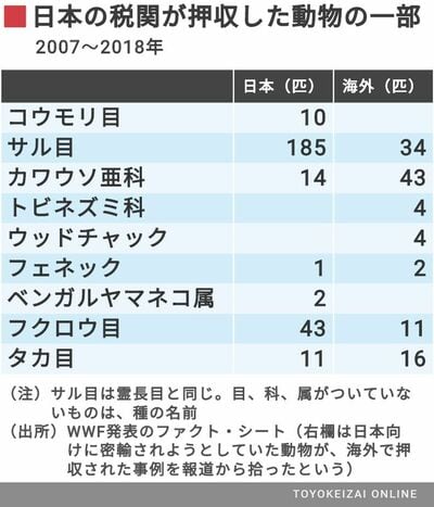 「TRAFFIC」は、絶滅の恐れのある野生生物の国際取引を規制する「ワシントン条約」に基づき、日本の税関当局が輸入を差し止めた記録を中心に、取引動向を把握した。その結果、調査期間(2007~2018年)中、計78件、1161匹のワシントン条約対象種が押収されていたことがわかった。直前の輸出国として特定できたのは13の国と地域で、主にタイ、中国本土、香港、インドネシアからの輸出が多かった。
