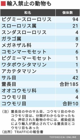 哺乳類は22件、計219匹で、約85%にあたる185匹はスローロリスなど霊長目。また、10匹はコウモリ目だった(下表参照)。日本は、空港や港湾など水際で、感染症法や狂犬病予防法に基づき、検疫や届け出の規制を行っている。なかでも、霊長目の輸入は原則禁止(研究や展示目的の場合、証明書の提出など厳しい条件をつけて許可)、コウモリ目の輸入は禁止されている。