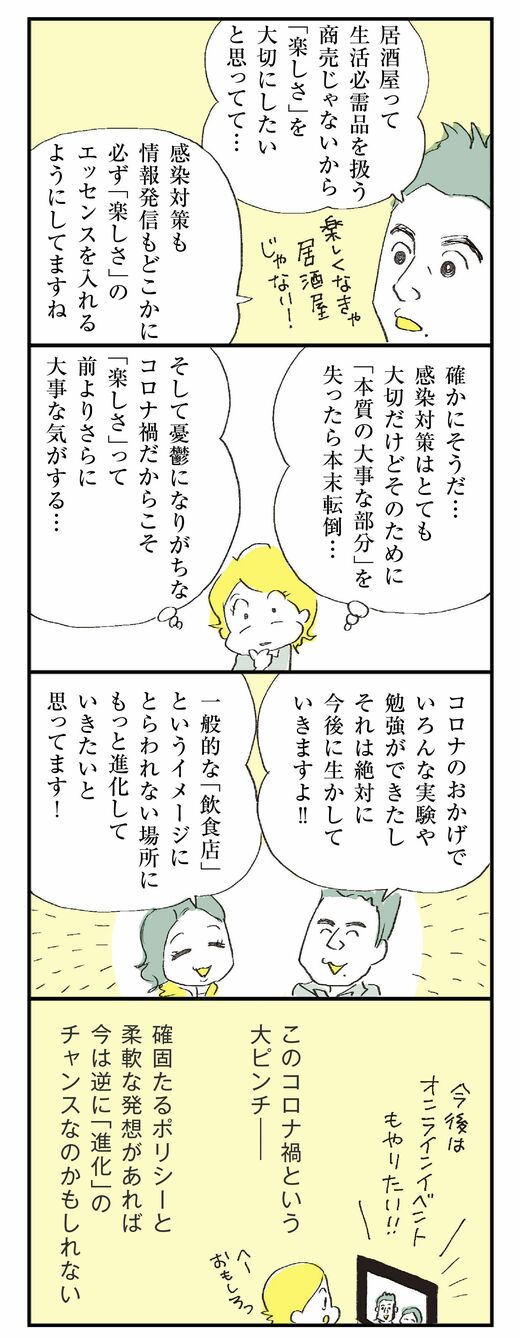 ライフ #ほしいのは「つかれない家族」 前の記事 次の記事 コロナに「めげない居酒屋」の明るすぎる超対応 「何でもやるぜ!」の精神が生む"アイデア" 3分で読める 公開日時:2020/06/14 05:25 ハラユキ イラストレーター、コミックエッセイスト フォロー 1/8 PAGES 2/8 PAGES 3/8 PAGES 4/8 PAGES 5/8 PAGES 6/8 PAGES 7/8 PAGES 「楽しさ」という大目標を忘れない 次ページが続きます:【ついには地元テレビ局が…】 8/8 PAGES